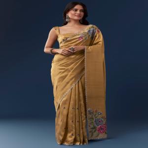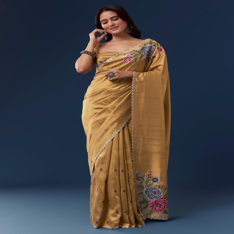 This mustard yellow tussar saree exudes casual charm with its soft texture and vibrant hue. The scallop border adds a delicate finish while the multicolor floral embroidery crafted with resham thread creates a lively and artistic appeal. It comes with an unstitched embroidered blouse allowing you to tailor it to your preferred style for a graceful and versatile look. Awarded as the Most Trusted Brand, we're delivering styles you love, just as promised.