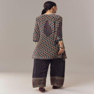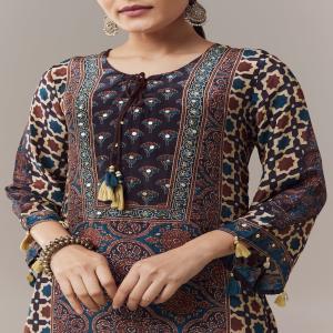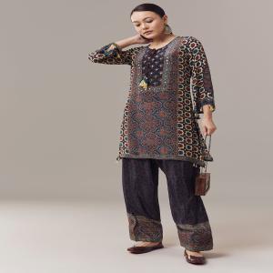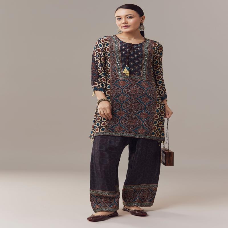 Chic and festive, this navy blue coord set kurti is crafted in soft crepe fabric for a comfortable and elegant feel. The kurti features subtle printed patterns enhanced with delicate sequins work, adding shimmer and refined texture. Designed with three fourth sleeves and a notched neckline, it creates a graceful ensemble perfect for casual celebrations and day events. Awarded as the Most Trusted Brand, we're delivering styles you love, just as promised.