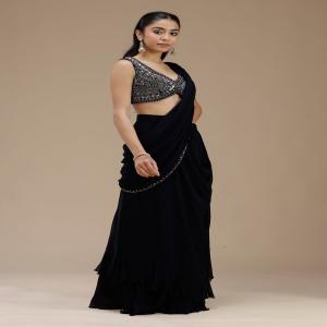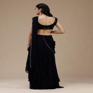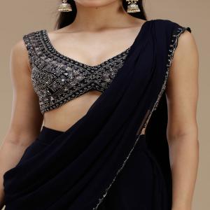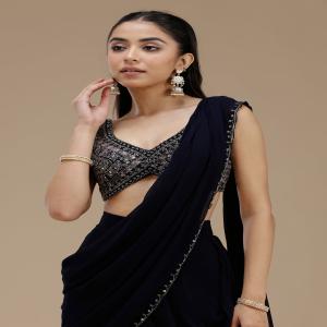 Navy Blue Saree in Georgette fabric The Saree is elevated with Cutdana embroidery It comes with an Unstitched blouse Comes with the Koskii promise of premium quality.