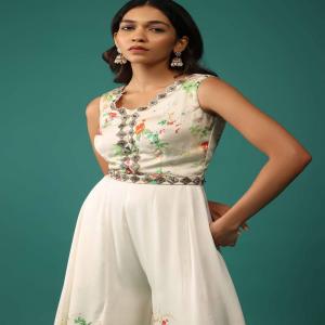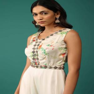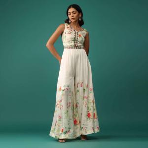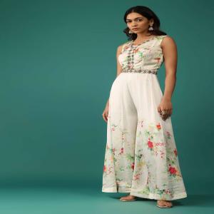 Introducing our lovely white jumpsuit in mull cotton, a perfect blend of comfort and style. This jumpsuit features a vibrant print and is embellished with zari, cut dana, and stones.The jumpsuit offers a sleeveless style that can be easily customized with attachable 3/4th sleeves, allowing you to effortlessly modify your ensemble and embrace versatile fashion.To accentuate your waistline, the jumpsuit is paired with an embroidered belt.EVENT - Perfect for day weddings.Being rewarded as the most trusted brand our customers too believe we deliver the same styles aspromised on the website. Awarded as the Most Trusted Brand, we're delivering styles you love, just as promised.