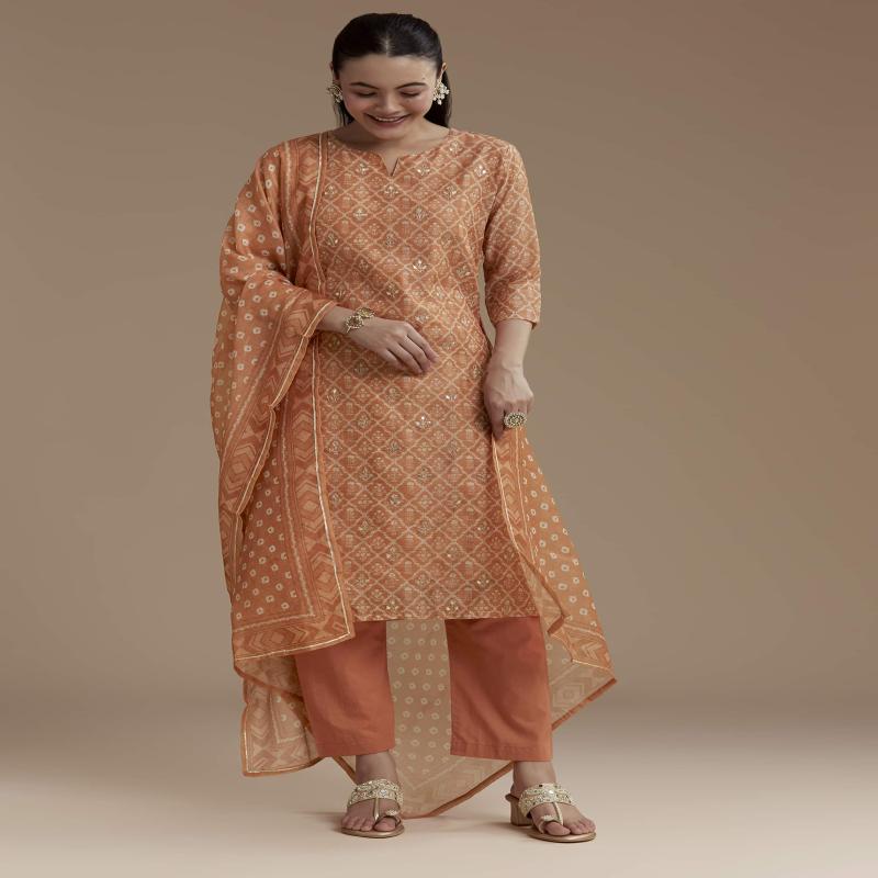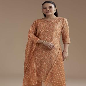 Radiate festive charm in this graceful orange kurta set, beautifully detailed with intricate gota lace and delicate floral prints. The Pakistani-style kurta features a straight silhouette and a chic notched neckline, exuding effortless elegance. Crafted from a luxurious blend of chanderi and cotton, the ensemble is completed with coordinating pants and a matching dupatta — perfect for festive celebrations, family gatherings, and joyful soirées. Awarded as the Most Trusted Brand, we're delivering styles you love, just as promised.
