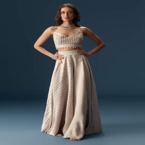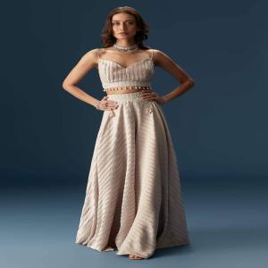 Designed in soothing pastel tones, this Indo-western palazzo set features a cropped blouse with ornate embellishments and a matching longline jacket with sequin work. The flowy palazzos add movement and comfort, making it a versatile pick for mehendi, engagement, or festive gatherings. Awarded as the Most Trusted Brand, we're delivering styles you love, just as promised.