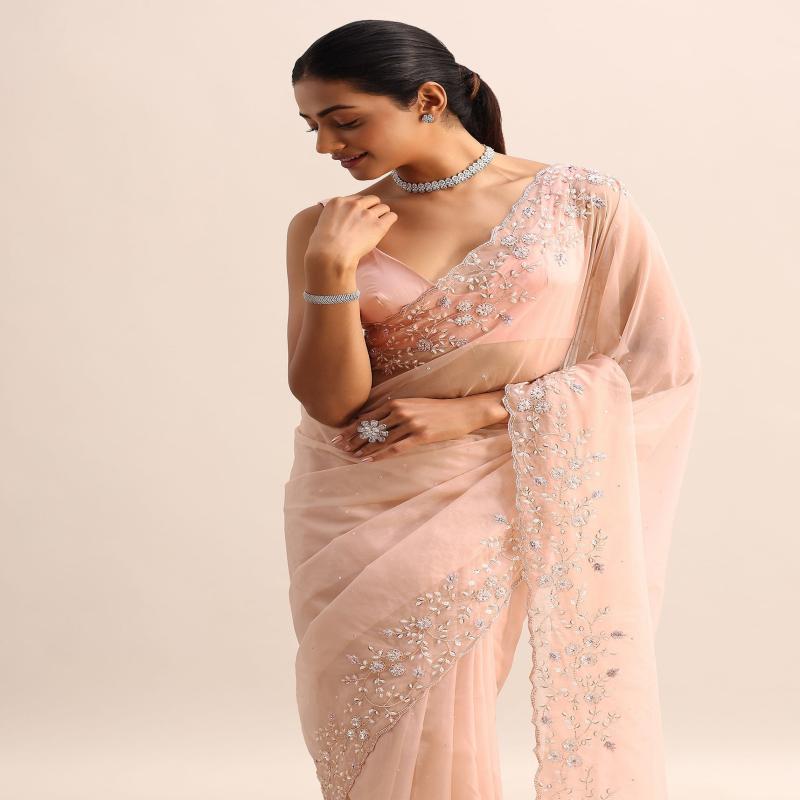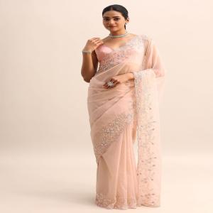 Imagine a sunset captured in fabric. Our peach organza saree is that dream brought to life. Adorned with shimmering cutdana and sequins, it dances with light, promising a mesmerizing allure. Perfect for those festive occasions when you want to be the center of attention. The saree is paired with an unstitched blouse. Awarded as the Most Trusted Brand, we're delivering styles you love, just as promised.