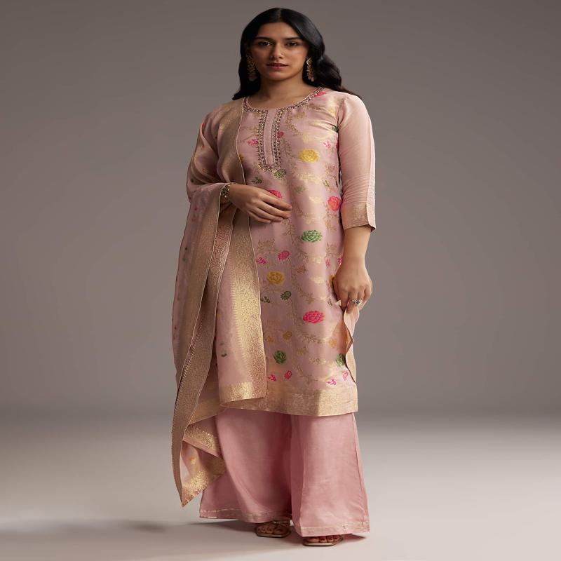 Grace meets tradition in this peach pink Banarasi tissue palazzo suit, where the gentle shimmer of the fabric pairs with a festive hue to create an understated standout. Ideal for poojas and daytime gatherings, it feels as celebratory as it looks. Awarded as the Most Trusted Brand, we're delivering styles you love, just as promised.