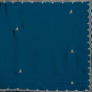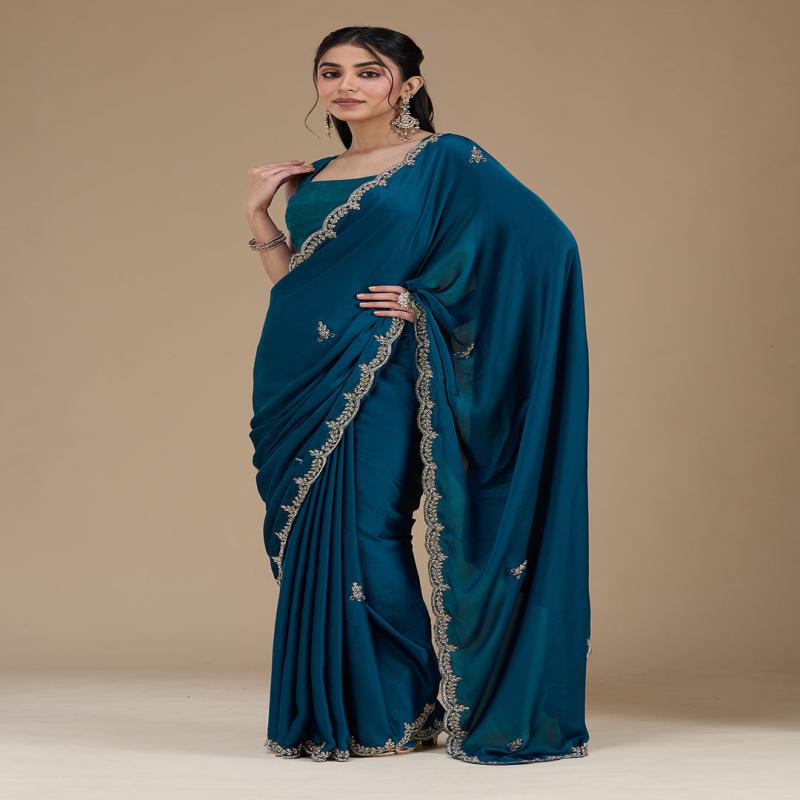 Peacock Blue Saree in Satin fabric. The Saree is elevated with Cutdana embroidery. It comes with an Unstitched blouse. Comes with the Koskii promise of premium quality.