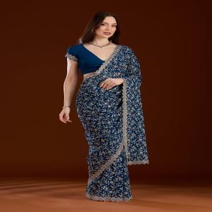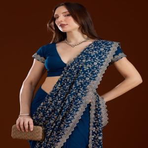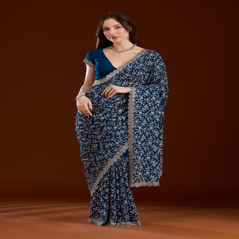 Peacock Blue Saree in Georgette fabric. The Saree is elevated with Zariwork (Silver) embroidery. It comes with an Unstitched blouse. Comes with the Koskii promise of premium quality.