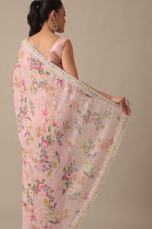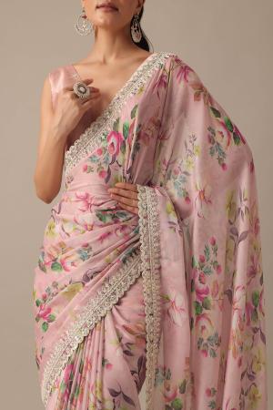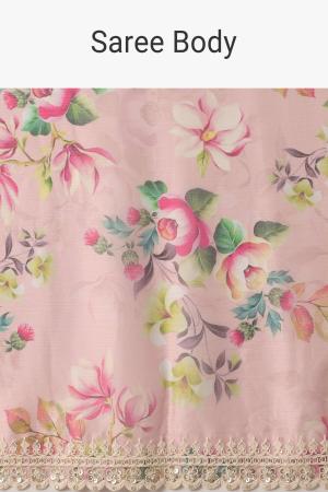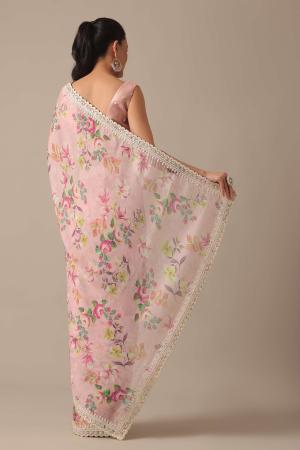 Pink Chiffon Saree With Floral Prints And Unstitched Blouse Piece