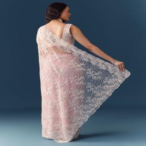 Pink Net Floral Jaal Cutdana Work Saree with Unstitched Blouse