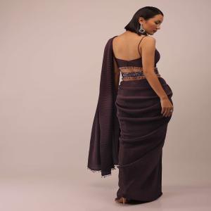 Plum saree with a spaghetti straps crop top. The saree is crafted in crush with a side zip closure. It has moti and cut dana fringes on the border. It is paired with the crop top in spaghetti straps with a back hooks closure. It comes in a sweetheart neckline and has padding. with the moti and cut dana fringes on the hemline. It is paired with an embroidered belt in moti and cut dana with stones and moti fringes and has a hooks closure. Awarded as the Most Trusted Brand, we're delivering styles you love, just as promised.