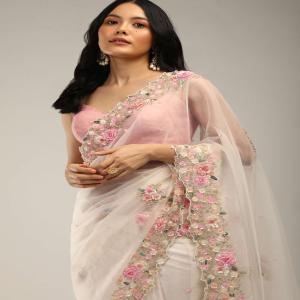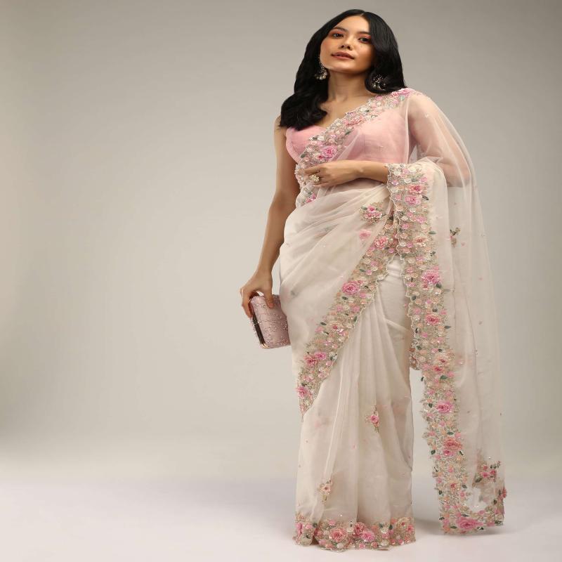 Powder white saree in organza with 3D flower embroidered border and buttis adorned in multi colored moti, sequins and cut dana work. Paired with an unstitched blouse piece. Awarded As The Most Trusted Brand We'Re Delivering Styles You Love Just As Promised.
