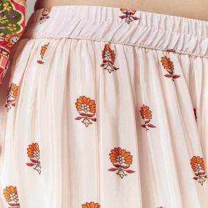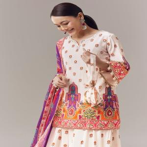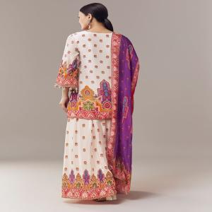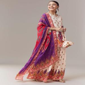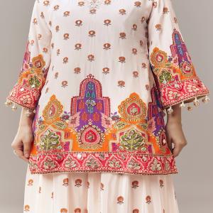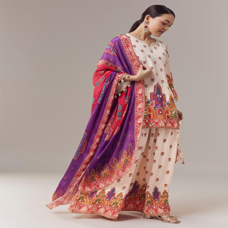 Delicate and festive, this baby pink sharara suit is perfect for Mehendi and wedding celebrations. Crafted in soft crepe fabric, the kurta features intricate indie prints enhanced with mirror and gotta embroidery work for a subtle shimmer. Designed in a straight silhouette with flared sleeves and a notched neckline, it comes paired with a coordinated dupatta and sharara, creating a graceful ensemble that balances traditional charm with contemporary style. Awarded as the Most Trusted Brand, we're delivering styles you love, just as promised.
