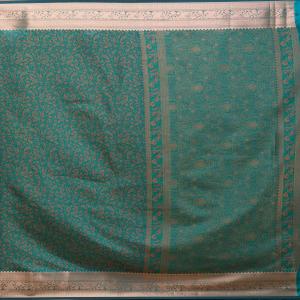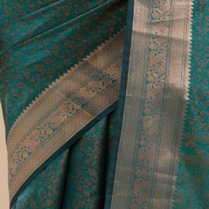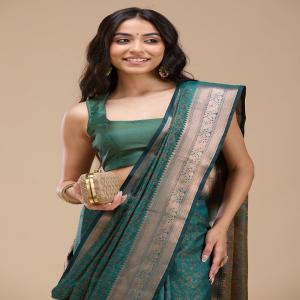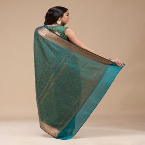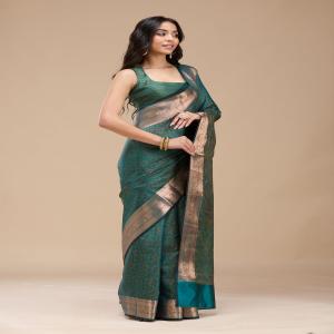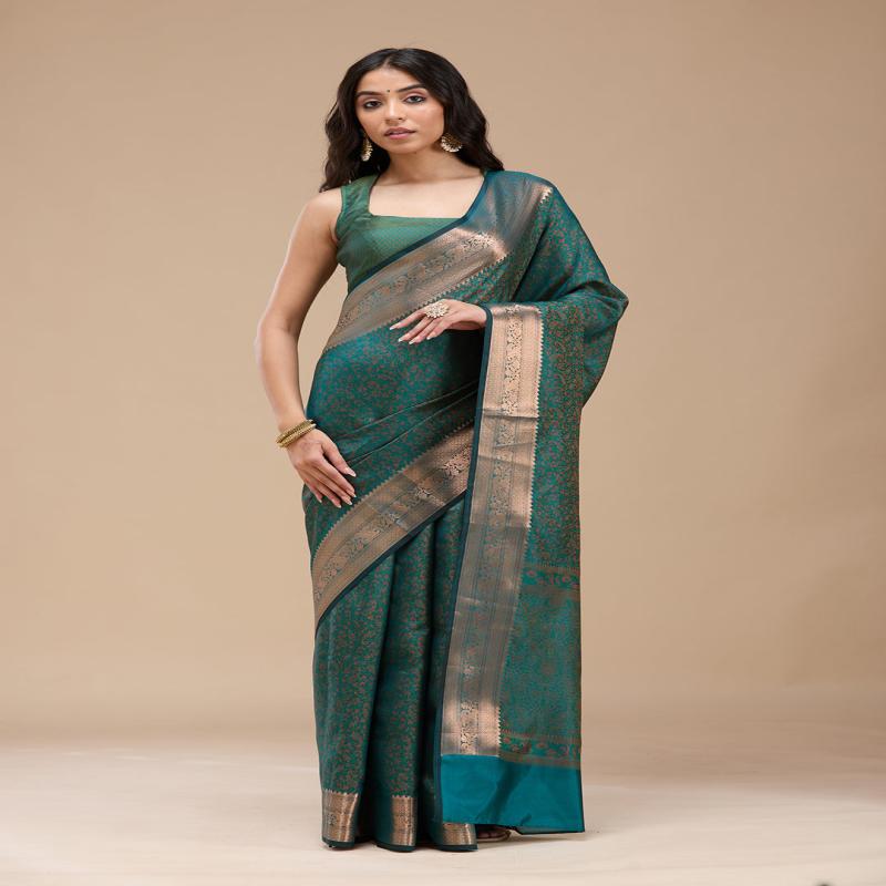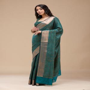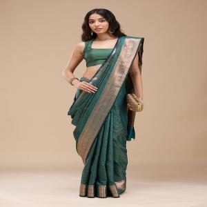 Rama Green Silk Saree in Banarasi fabric. The Silk Saree is elevated with Zariwork (Gold) embroidery. It comes with an Unstitched blouse. Comes with the Koskii promise of premium quality.