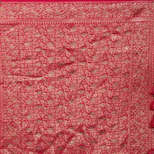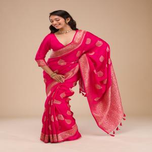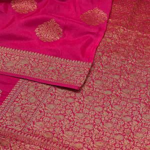 Rani pink saree in banarasi fabric. The saree is embellished with zari work and swarovski stone work. Accompanied with a matching unstitched blouse. The blouse worn by the model is for styling purpose only. Comes with the koskii promise of superior quality.