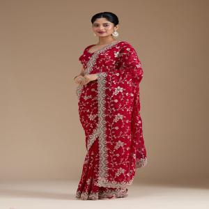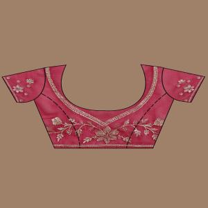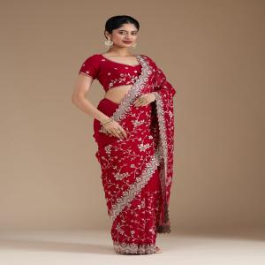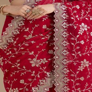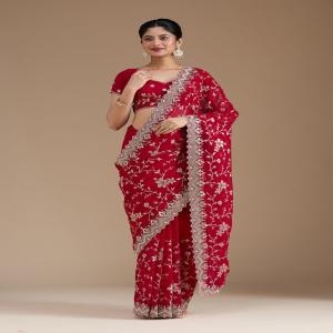 Rani Pink Saree in Georgette fabric. The Saree is elevated with Zariwork (Gold) embroidery. It comes with an Unstitched blouse. Comes with the Koskii promise of premium quality.