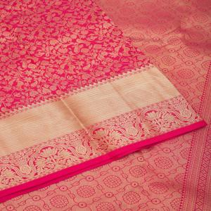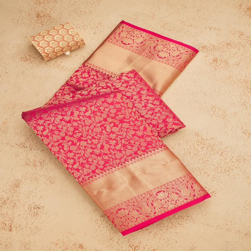 Rani Pink Saree in Pure Silk fabric. The Saree is elevated with Zariwork embroidery. It comes with an Unstitched blouse. Comes with the Koskii promise of premium quality.