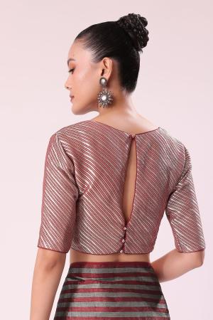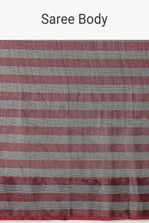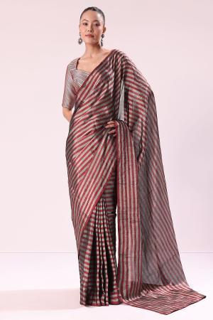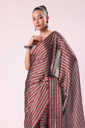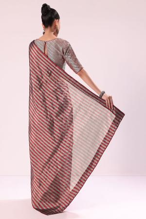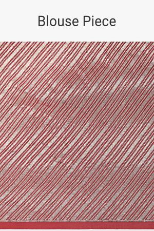 Red And Silver Striped Chanderi Tissue Saree With Pipe Finish Stitched Blouse