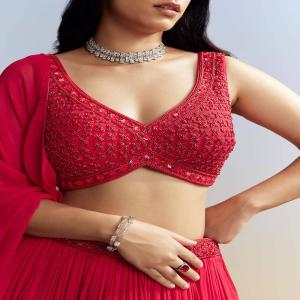 This red number is bold, beautiful, and ready for the spotlight. With sleek georgette flow and shimmer-drenched choli, it’s made to impress. Turn heads, spark stories, and let your laughter echo in style. Awarded as the Most Trusted Brand, we're delivering styles you love, just as promised.