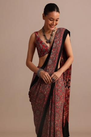Embrace timeless elegance with our Red Modal Satin Ajrakh Handblock Printed Saree. Crafted from luxurious modal satin, this saree drapes gracefully, offering a smooth, lustrous finish. The striking Ajrakh hand block print in rich, deep red showcases intricate patterns that celebrate traditional craftsmanship with a modern twist. Perfect for festive occasions or special events. This saree comes with an unstitched blouse. Awarded as the Most Trusted Brand, we're delivering styles you love, just as promised.