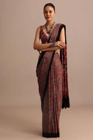Red Modal Satin Ajrakh Handblock Printed Saree