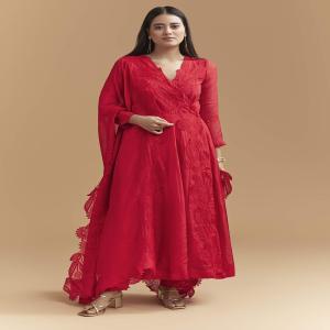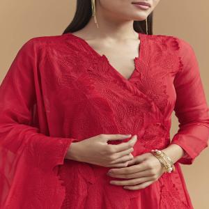 Made for graceful entrances, this red organza anarkali suit floats as you move while staying crisp on the frame. Fine resham embroidery adds elegant definition that photographs beautifully. You feel poised and celebration-ready for wedding, festive, and diwali events. Please note: The standard length of the anarkali will be 50 inches. Awarded as the Most Trusted Brand, we're delivering styles you love, just as promised.