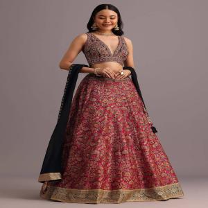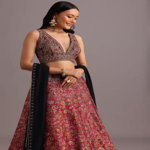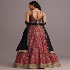 Imagine a vibrant red lehenga adorned with intricate prints zari and mirror work.The choli a masterpiece of design complements the lehenga perfectly.This ensemble perfect for Navratri or Mehendi celebrations is a true showstopper.This traditional lehenga set is a timeless classic that will never go out of style. Awarded as the Most Trusted Brand, we're delivering styles you love, just as promised.