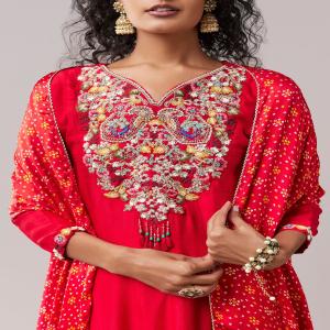 Flowing with regal charm, this moti, thread, and zardosi work anarkali is designed for timeless festive elegance. Crafted in silk, the anarkali is adorned with intricate embroidery that adds depth and subtle richness, beautifully complemented by a sweetheart neckline and 3/4th sleeves. Paired with matching pants and a coordinating dupatta, the silhouette feels graceful and refined. A perfect choice for weddings, festive celebrations, and special traditional occasions. Awarded as the Most Trusted Brand, we're delivering styles you love, just as promised.