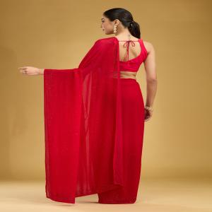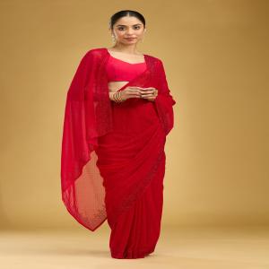 Red Saree in Georgette fabric. The Saree is elevated with Swarovski embroidery. It comes with an Unstitched blouse. Comes with the Koskii promise of premium quality.