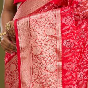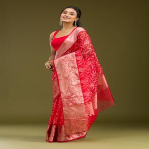 Red Silk_Saree in Silk fabric. The Silk_Saree is elevated with Zariwork (Gold) embroidery. It comes with an Unstitched blouse. Comes with the Koskii promise of premium quality.