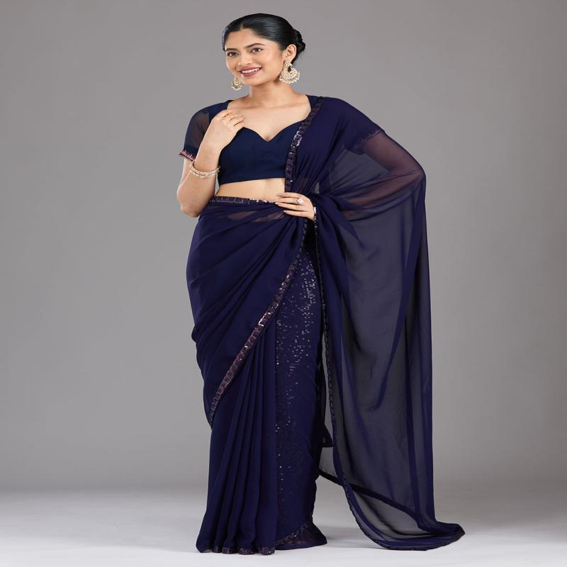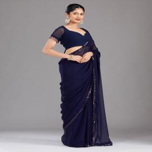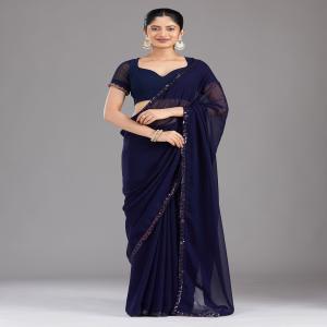 Royal Blue Saree in Georgette fabric. The Saree is elevated with Sequins embroidery. It comes with an Unstitched blouse. Comes with the Koskii promise of premium quality.