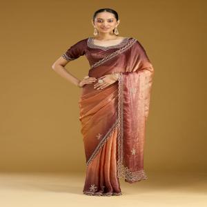 Rust Saree in Tissue fabric. The Saree is elevated with Stonework (Gold) embroidery. It comes with an Unstitched blouse. Comes with the Koskii promise of premium quality.