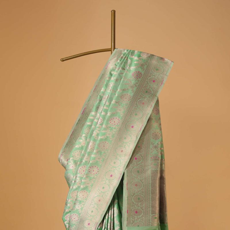 Introducing the stunning handloom Banarasi saree, crafted from exquisite uppada silk.The saree features a beautiful sea green hue adorned with intricate meenakari weave and gold zari work that adds a touch of opulence and glamour.The combination of these exquisite details makes this saree a true masterpiece.EVENT - Perfect for those who want to make a statement at weddings and formal events.Our premium handloom sarees might come with a slight weave difference. But that's what makes each saree a one-of-a-kind piece of art with authenticity intact in every thread.Do not use naphthalene balls or chemicals where you store the saree.Do not spill any liquids on the saree.Never use plastic or regular cardboard boxes to store the saree, instead wrap it in a muslin cloth.Provide good air circulation where you store the saree.Change folds after every use because folding it the same way might leave permanent creases on the saree.Protect the saree from humid weather, especially monsoon. Awarded as the Most Trusted Brand, we're delivering styles you love, just as promised.