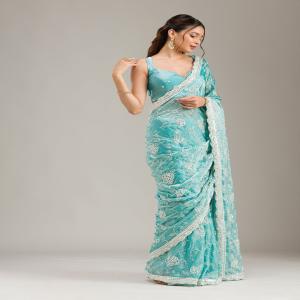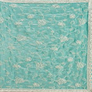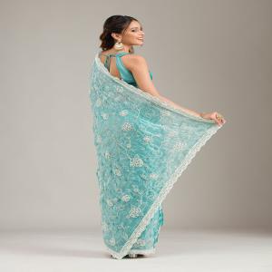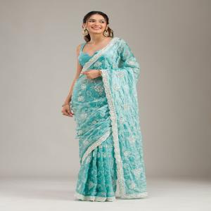 Sea Green Saree in Soft Raw Silk fabric The Saree is elevated with Kashmiri embroidery It comes with an Unstitched blouse Comes with the Koskii promise of premium quality.