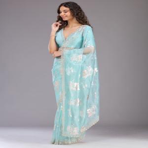 Sea Green Saree in Organza fabric. The Saree is elevated with Stonework (Gold) embroidery. It comes with an Unstitched blouse. Comes with the Koskii promise of premium quality.
