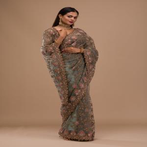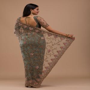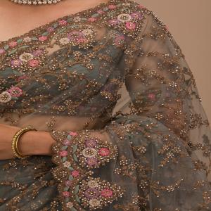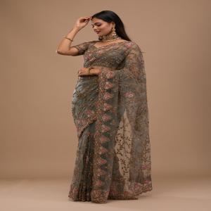 Radiate charm and grace with the Koskii Grey Saree, intricately adorned with vibrant pink zariwork that captures the spirit of celebration. Crafted from luxurious net fabric, this saree is a masterpiece of design, perfect for those who wish to blend traditional elegance with a touch of contemporary glamour. Let every twirl and every step you take be a statement of your unique style and ethereal beauty!.