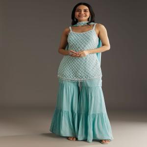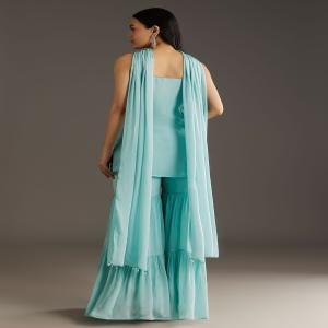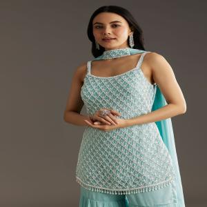 A sky blue kurta set in fluid chinon fabric embellished with sequins and beads work. The choker-style dupatta adds a modern edge, perfect for pre-wedding celebrations.Standard length for Sharara is 43 Inches. Awarded as the Most Trusted Brand, we're delivering styles you love, just as promised.