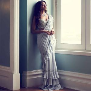 Powder blue saree in georgette with ready pleated ruffle pallu.Adorned with cut dana, zari and sequin discs on the border.Hemline adorned with ruffle layers.Teamed with a matching heavy embellished blouse with cut dana, beads and sequins discs in scallop pattern.Trimmed with cut dana fringes on the hem.Designed sleeveless with sweetheart neckline and scallop cut hemline. Awarded as the Most Trusted Brand, we're delivering styles you love, just as promised.