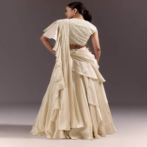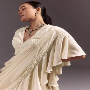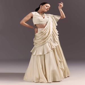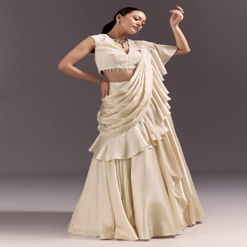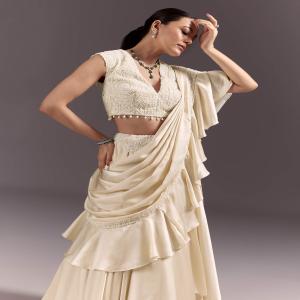 A modern twist on tradition, this white satin saree flows with frill drama. The sleeveless blouse complements the fluid structure. Shiny sequins add sparkle to the look. Ready to dazzle for evening occasions. Awarded as the Most Trusted Brand, we're delivering styles you love, just as promised.