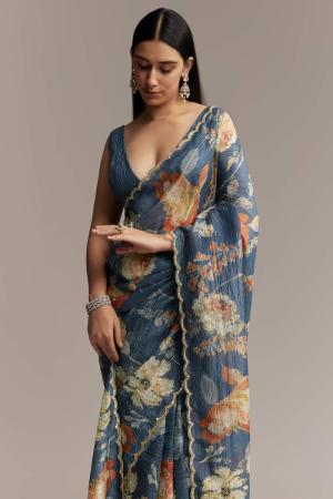 Teal Blue Tissue Saree With Floral Print And Embroidered Border