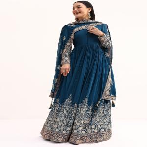 Teal Chinon Anarkali Suit With Zari Work