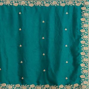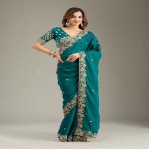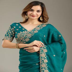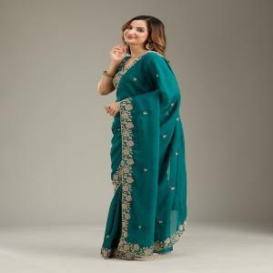 Teal Green Saree in Georgette fabric The Saree is elevated with Cording embroidery It comes with an Unstitched blouse Comes with the Koskii promise of premium quality.