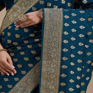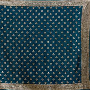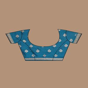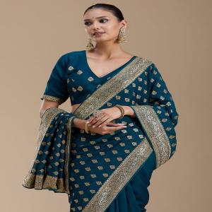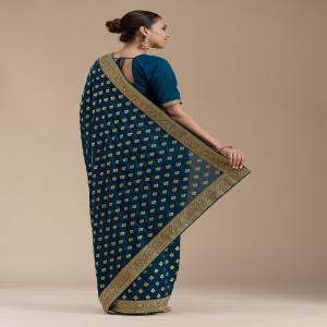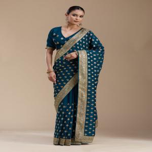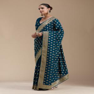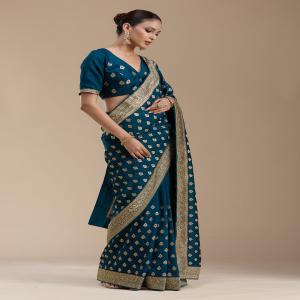 Teal Green Saree in Soft Raw Silk fabric. The Saree is elevated with Zariwork (Gold) embroidery. It comes with an Unstitched blouse. Comes with the Koskii promise of premium quality.