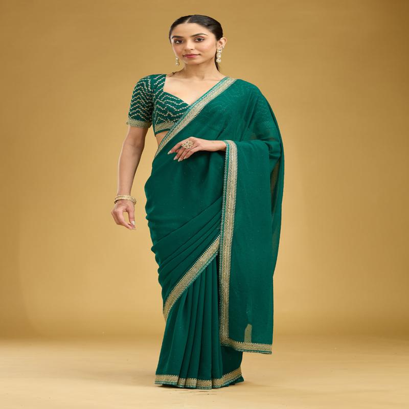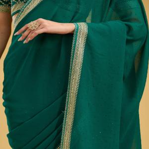 Teal Green Saree in Georgette fabric. The Saree is elevated with Zariwork (Silver) embroidery. It comes with an Unstitched blouse. Comes with the Koskii promise of premium quality.