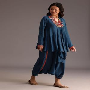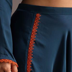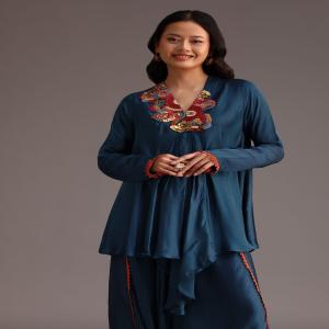 A teal tapestry a boho dream. Adorned with delicate thread and beadwork dancing gracefully over a laceembellished dhoti. The satin fabric shimmers like moonlight while the teal hue adds a touch of sophistication. This ensemble perfect for parties. Awarded as the Most Trusted Brand, we're delivering styles you love, just as promised.