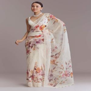 Sunlit moments feel fresh in this white organza printed saree that moves beautifully in pictures. Multicolour floral prints meet a scallop border and bead embroidery on the saree and blouse, finished with tassels at the pallu. It is a lively choice for day functions when you want colour and lightness to do the work. Awarded as the Most Trusted Brand, we're delivering styles you love, just as promised.