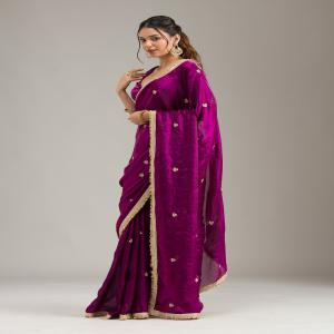 Wine Saree in Tissue fabric The Saree is elevated with Stonework (Gold) embroidery It comes with an Unstitched blouse Comes with the Koskii promise of premium quality.