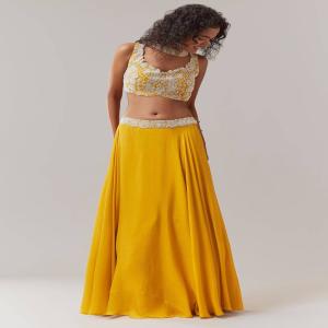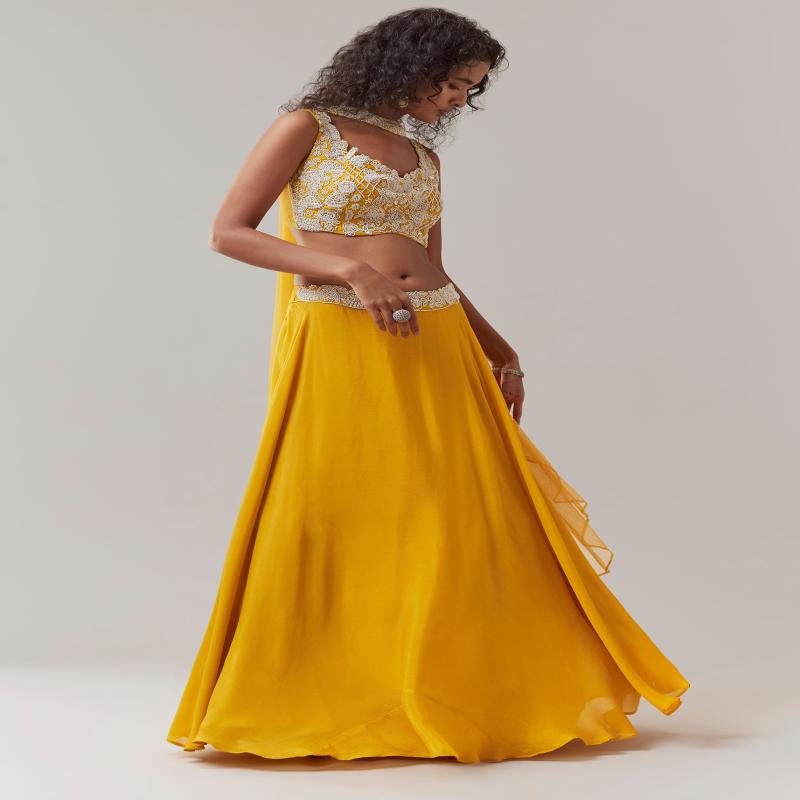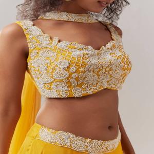 Bright, joyful, and full of festive charm, this yellow moti work choli lehenga set brings a fresh and vibrant appeal. The sleeveless choli is adorned with delicate moti work and features a fancy back cut that adds a playful modern twist. Paired with a flowing chinon lehenga and a chic choker style dupatta, the ensemble creates a lively yet elegant silhouette. Perfect for haldi ceremonies, daytime weddings, festive celebrations, and joyful gatherings.