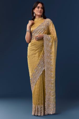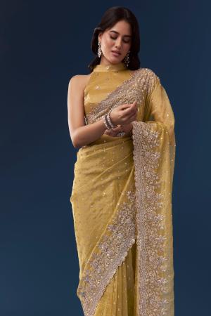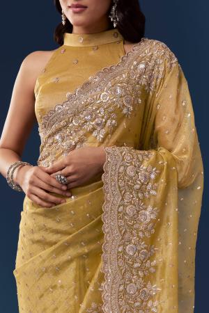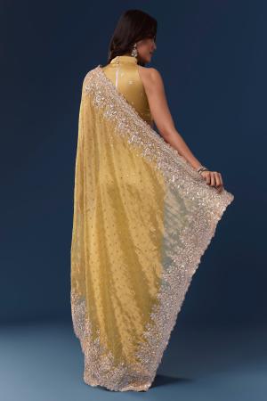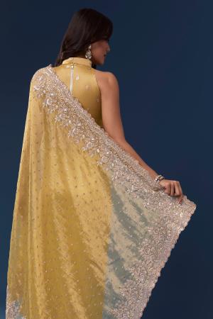 Yellow Tissue Saree With Scallop Heavy Embroidered Border And Sequin Work